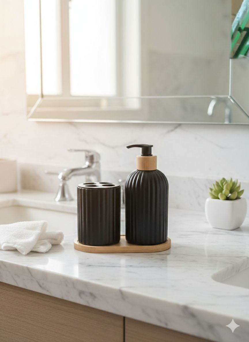 Beautiful Glass 2 Piece Bathroom Set with Bamboo Stand - Black